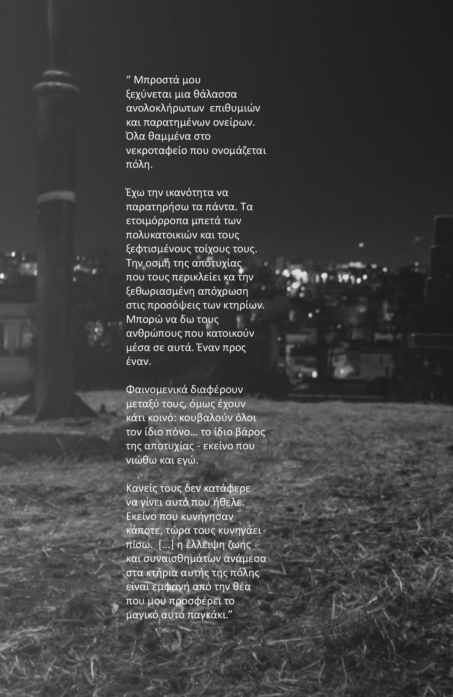 ” Μπροστά μου ξεχύνεται μια θάλασσα ανολοκλήρωτων επιθυμιών και παρατημένων ονείρων. Όλα θαμμένα στο νεκροταφείο που ονομάζεται πόλη.